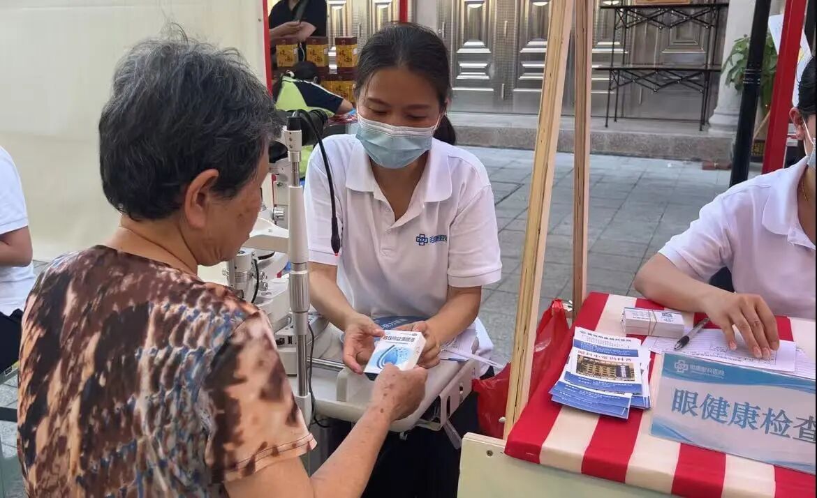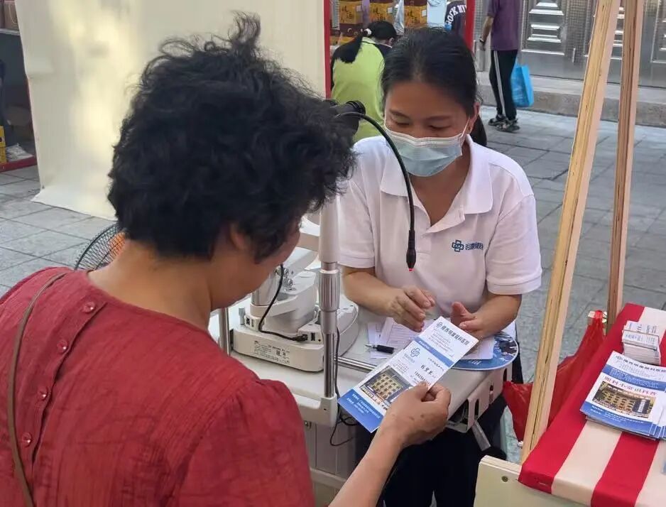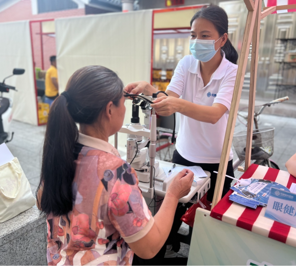 我院志愿服务工作者携带专业眼科设备,为群众进行视力检查与裂隙灯检查,并为群众科普眼科相关知识,为适应症群众赠送公益物资,倡导眼疾早防、早筛、早诊、早治的重要性。