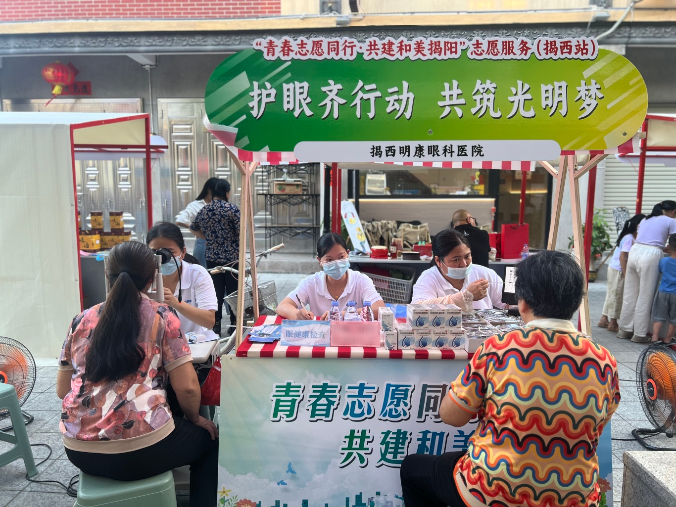 2025年6月22日下午,我院积极参与由团市委主办、团县委承办的“2025年青年助推和美揭阳建设志愿服务活动(揭西站)”,在棉湖镇解放路,为群众进行眼健康公益筛查。此举不仅深入学习贯彻党的二十大、二十届二中、三中全会精神和习近平总书记关于志愿服务的重要论述,助推和美揭阳建设贡献青春力量,还进一步落实了习近平总书记关于眼健康工作重要指示批示精神,聚焦近视等屈光不正、白内障等重点眼病的筛查,大力宣传全年龄段全生命周期眼健康的重要意义。