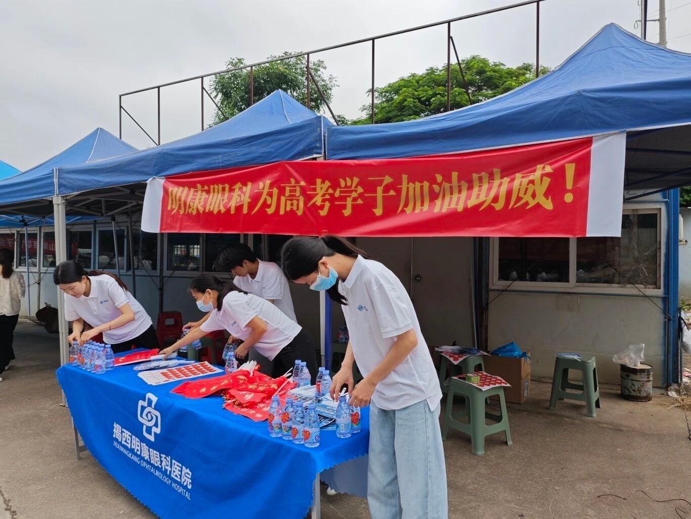 高考首日,我院启动了“明康睛彩护航高考”的志愿者服务行动,在河婆中学、霖田中学两个考点设立的高考助力服务站,为考生、家长及执勤人员精心准备了饮用水、清凉扇和助威红旗。