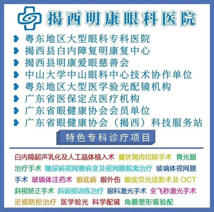 今天是第27个全国“爱眼日”,近日,揭西明康眼科医院围绕“关注普遍眼健康,共筑‘睛’彩大健康”主题开展了一系列的爱眼活动,贯彻执行《“十四五”全国眼健康规划(2021-2025年)》内容,强化眼病防治宣传教育,重点关注儿童青少年、老年人两个重点人群,重点关注儿童青少年、老年人两个重点人群,同时聚焦屈光不正、白内障、眼底病、青光眼等重点眼病。倡导“每个人都是自己健康第一责任人”的理念,增强群众爱眼护眼意识,营造全社会爱眼护眼良好氛围。