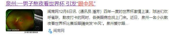 泉州一35岁男子,世界杯期间连续几天熬夜看球后,感觉眼睛模糊不清、眼前有物体飘动,检查后确诊“眼中风”。